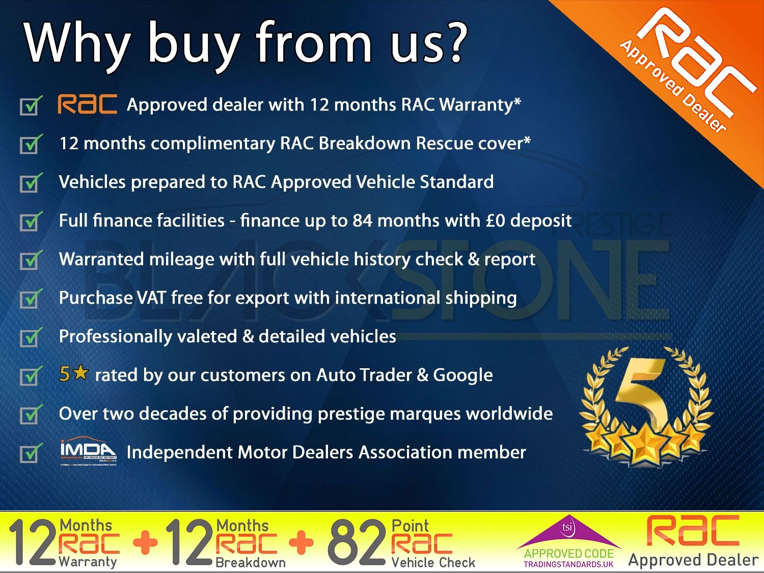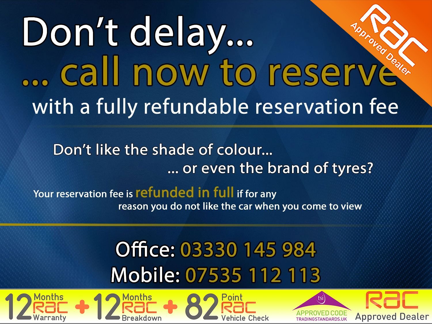 - Visit our website for up to 100 IMAGES. Purchase from an RAC APPROVED DEALER with 12 MONTHS RAC WARRANTY* & 12 MONTHS BREAKDOWN RESCUE*. HPI REPORT, RAC PREP REPORT, SERVICE BOOK/PRINT & TWO KEYS. Credit/Debit cards accepted. Part exchange welcome. Low rate PCP/HP/ECP finance up to 84 months. Indoor showroom. Viewings by appointment. Showroom: 03330 145984. Mobile: 07535 112113. Most cars VAT Qualifying. Purchase VAT free for export. *T&C's apply. e&oe.