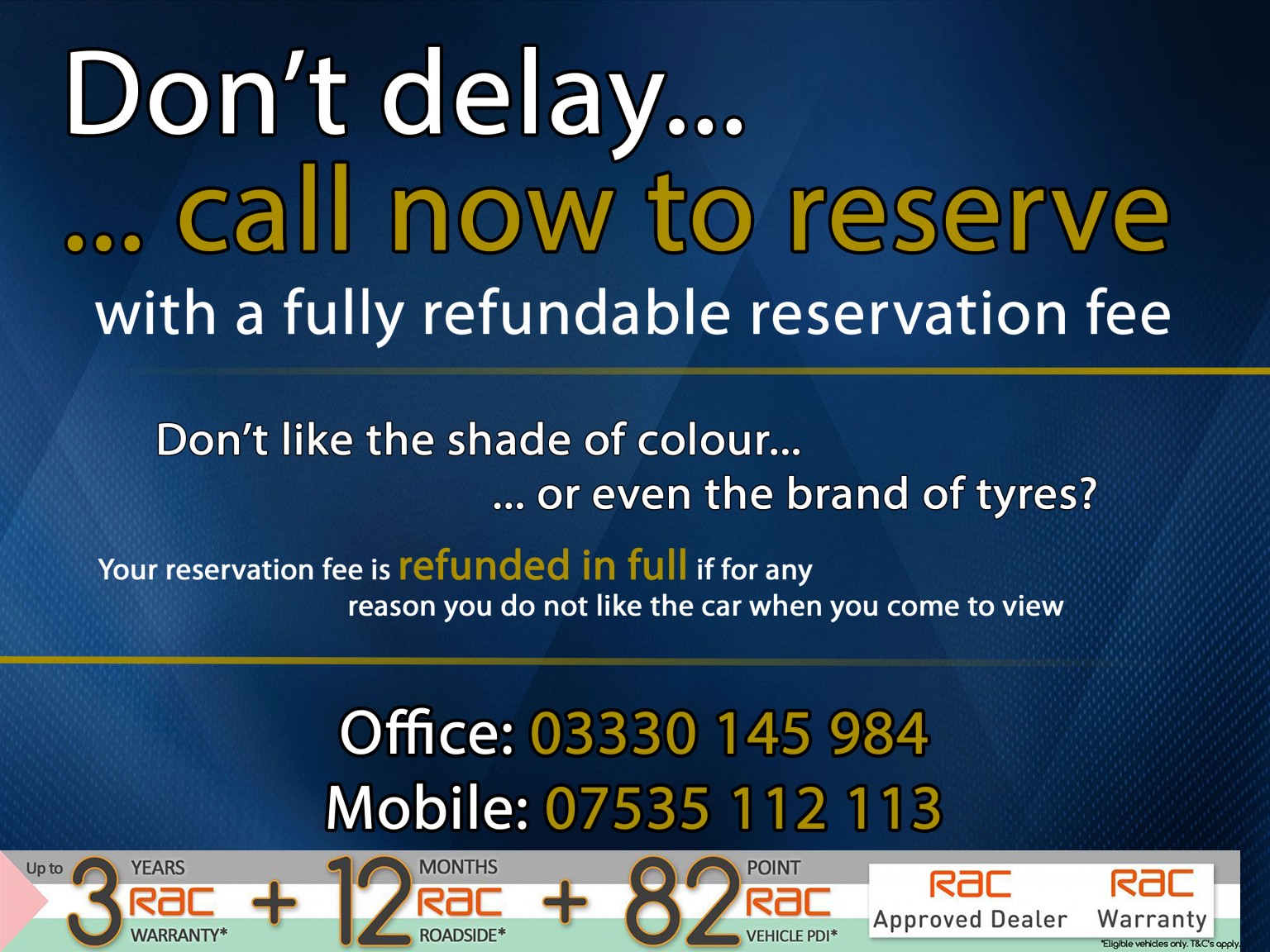 - Visit our website for up to 100 IMAGES. Purchase from an RAC APPROVED DEALER with up to 36 MONTHS RAC WARRANTY*, 12 MONTHS ROADSIDE RESCUE*. HPI CLEAR WITH REPORT, 82 POINT RAC PREPARATION STANDARD* & SERVICE BOOK/PRINT/DIGITAL. Part exchange welcome. Low rate PCP/HP/ECP finance up to 84 months. Indoor showroom. Viewings by appointment. Showroom: 03330 145984. Mobile: 07535 112113. Most cars VAT Qualifying. Virtual viewing. Purchase VAT free for export. Specification information is supplied by a third party and as such may vary to the actual car. This data does not form any part of a buying contract. Please confirm specification prior to purchase. *For all qualifying vehicles, T&C's apply. e&oe.